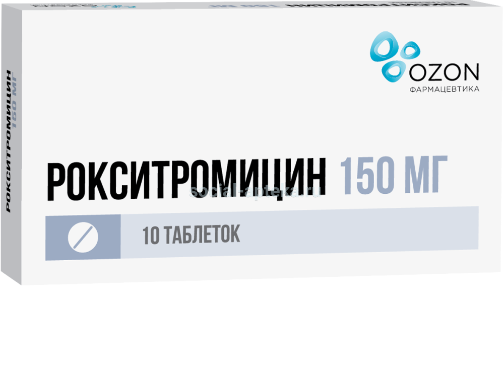 Активное вещество: рокситромицин - 150,00 мг. Вспомогательные вещества (ядро): целлюлоза микрокристаллическая - 127,50 мг; карбоксиметилкрахмал натрия - 9,00 мг; повидон (поливинилпирролидон) - 9,00 мг; магния стеарат - 3,00 мг; кремния диоксид коллоидный - 1,50 мг. Вспомогательные вещества (оболочка): опадрай II Белый - 10,00 мг, в т.ч. поливиниловый спирт - 4,69 мг; макрогол-3350 - 2,36 мг; тальк - 1,74 мг; титана диоксид - 1,21 мг.