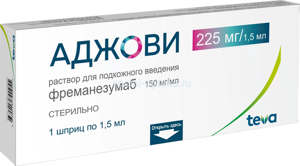 - Каждый шприц препарата Аджови содержит 225 мг фреманезумаба. В зависимости от назначенного врачом режима дозирования могут потребоваться один или три шприца.