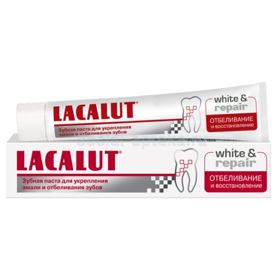 Зубная паста LACALUT white&repair обладает антисептическим, отбеливающим, антикариозным, противовоспалительным, дезодорирующим, репарирующим, реминерализирующим и десенситивным эффектом. Зубная паста LACALUT white&repair производится на фармацевтическом заводе в Германии. Зубная паста LACALUT white&repair одобрена Стоматологической Ассоциацией России.